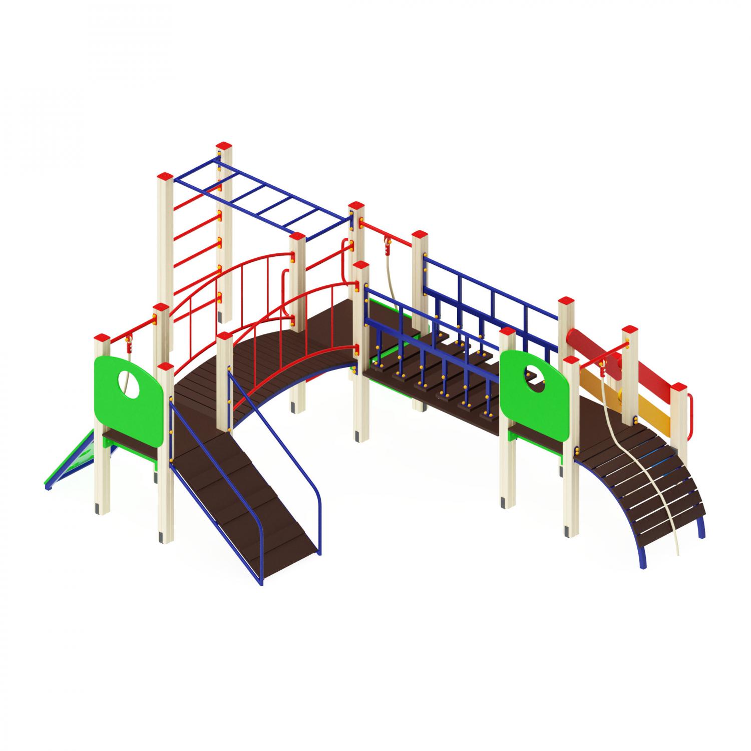 Подвесной мостСостоит из половиц, выполненных из ламинированной антискользящей фанеры, размером 800х180х18 мм, в количестве 6 шт, подвешенных на каркасе, выполненном из металлической профильной трубы. Общая длина моста 1500 мм, ширина 800 мм, высота 650 мм. Под половицами установлен страховочный мост из ламинированной антискользящей фанеры крепящейся к стальному каркасу из профильной трубы размером 40х40 мм.