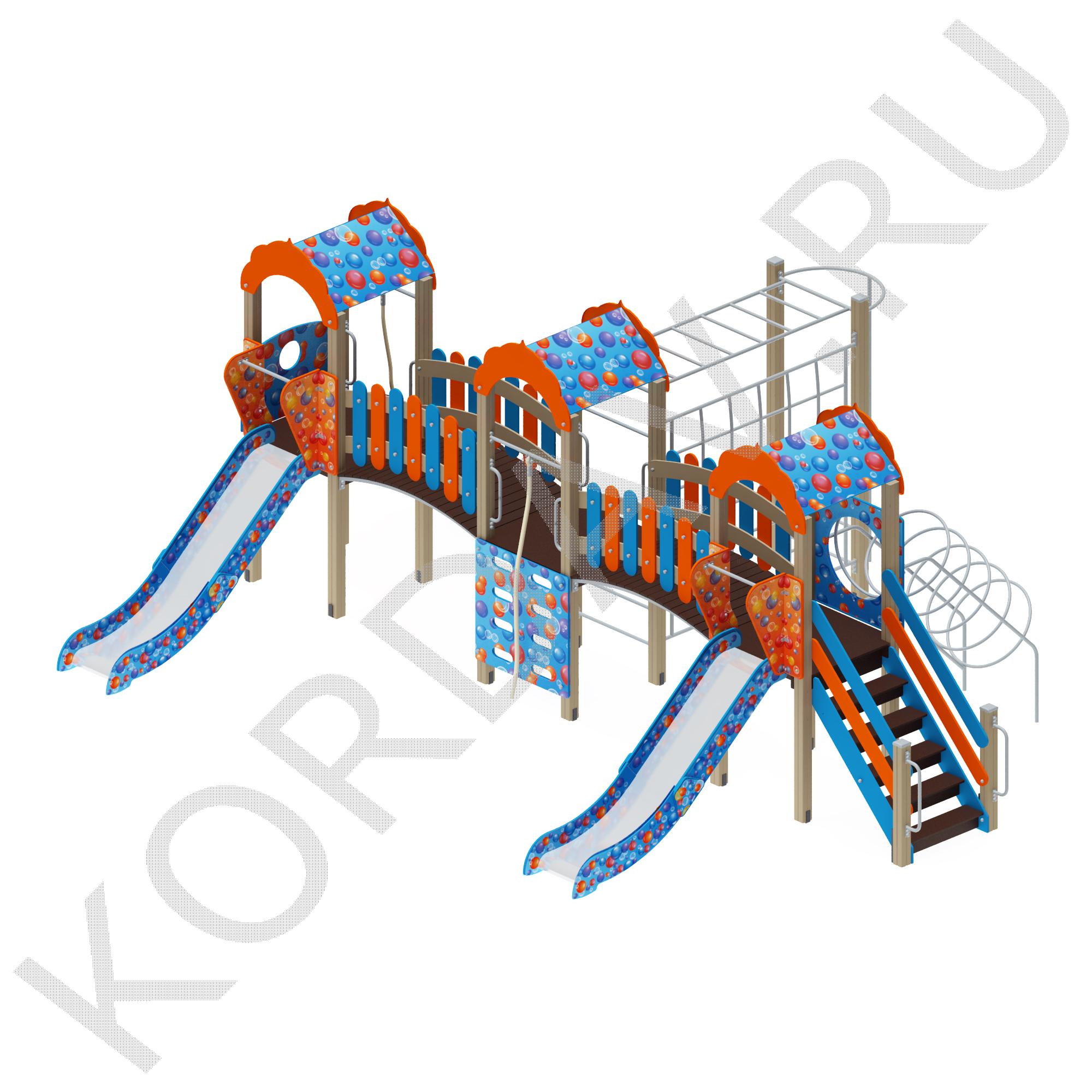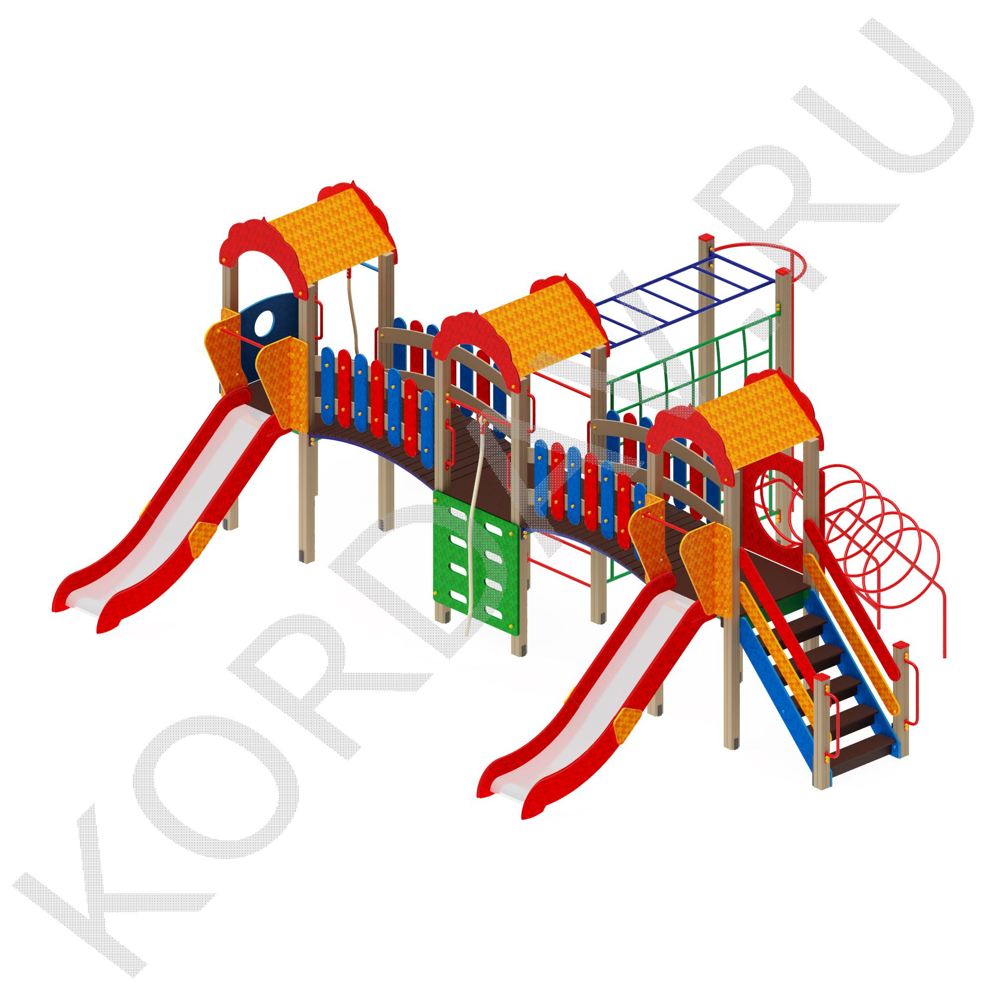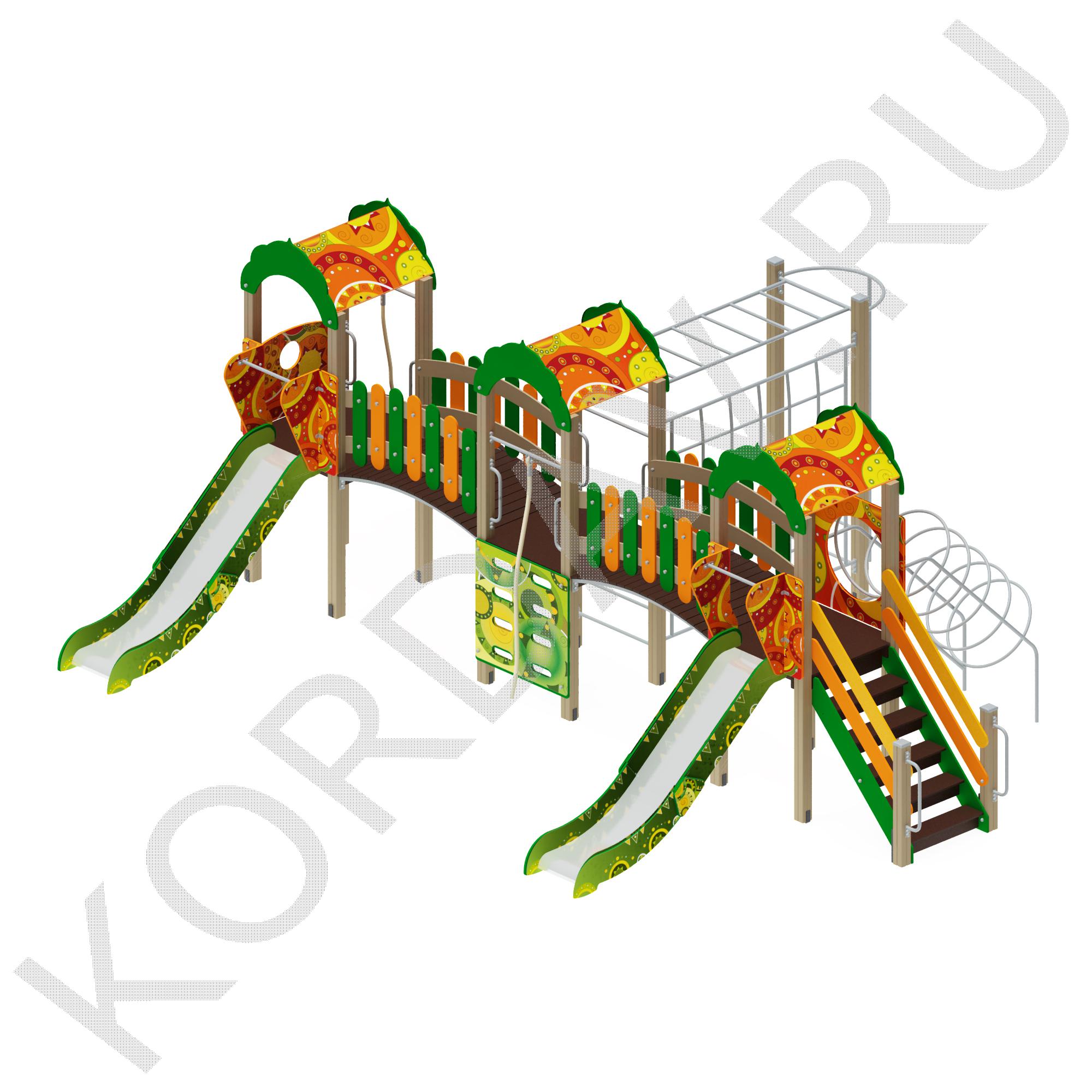 Комплектация игрового комплекса: Башня 3шт, Горка 2шт, Скалолаз, Лестница, Дугообразный мост 2шт, Рукоход, Решетка для лазания, Канат, Вертикальный шест, Лаз - труба, Лаз-дуга.