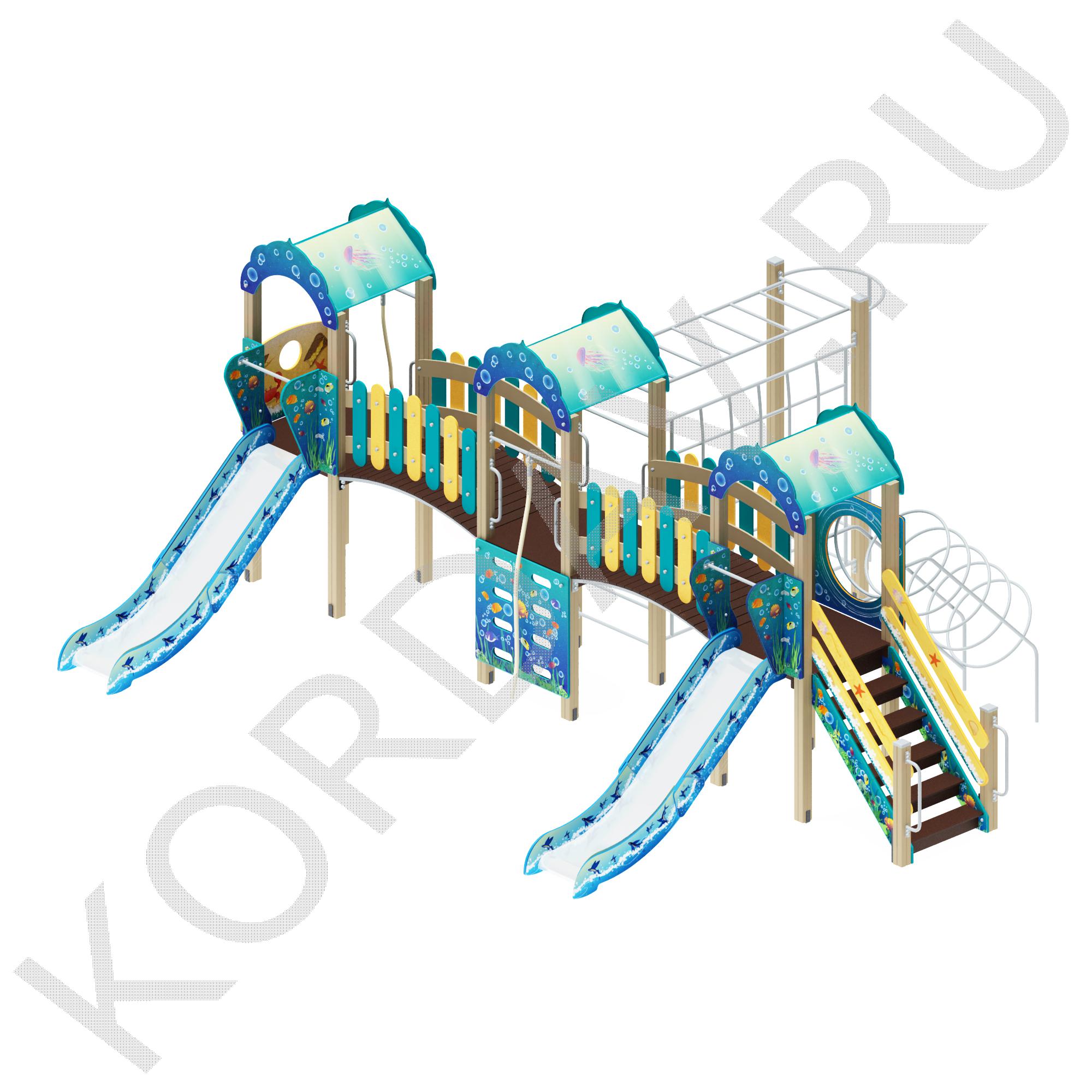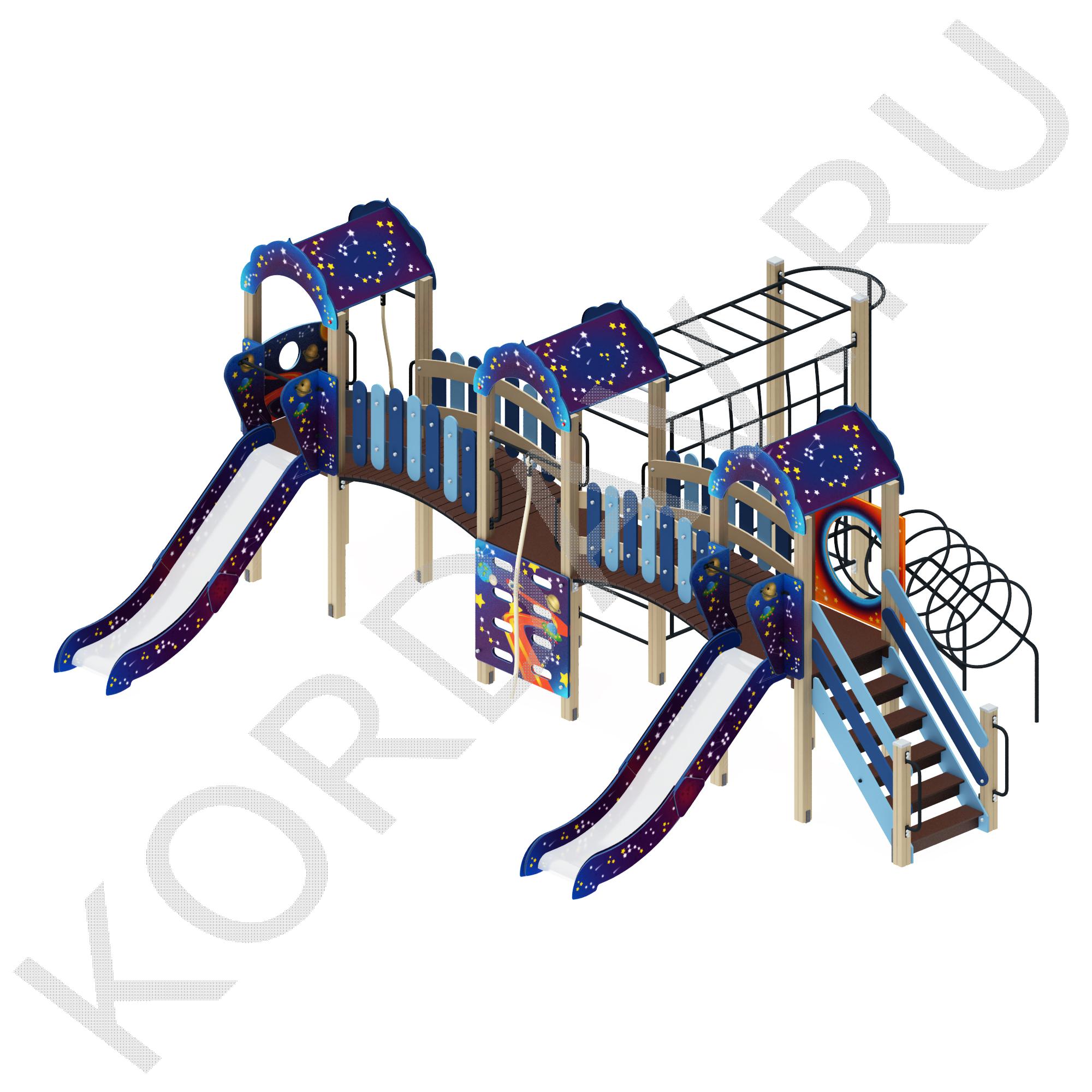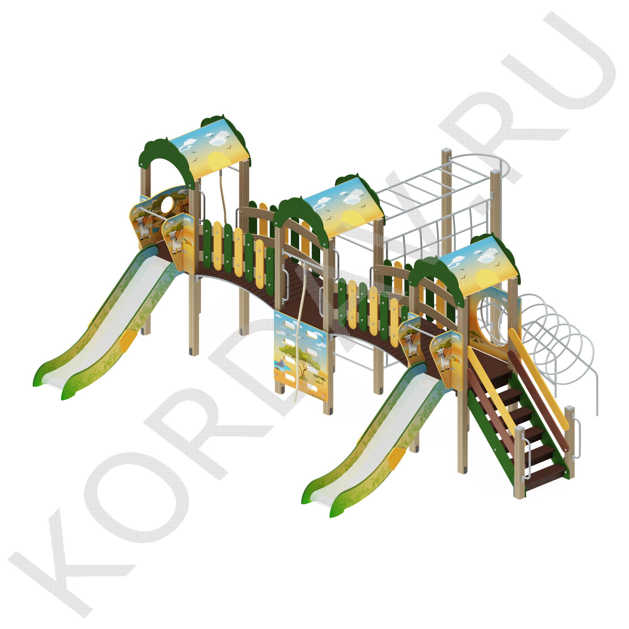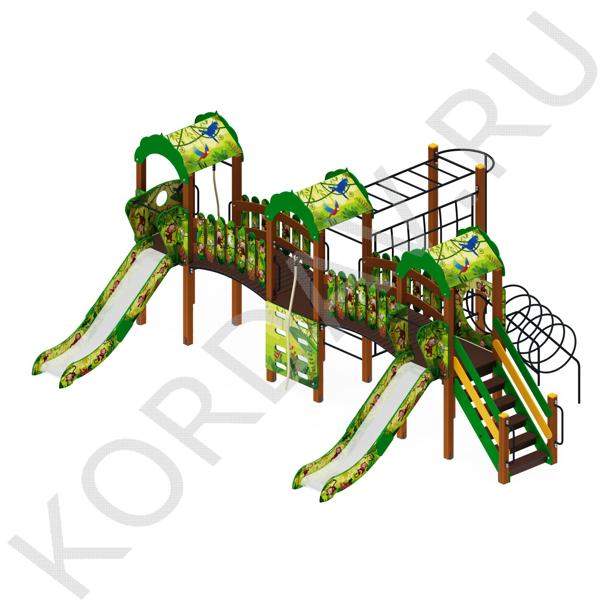 Комплектация игрового комплекса: Башня 3шт, Горка 2шт, Скалолаз, Лестница, Дугообразный мост 2шт, Рукоход, Решетка для лазания, Канат, Вертикальный шест, Лаз - труба, Лаз-дуга.