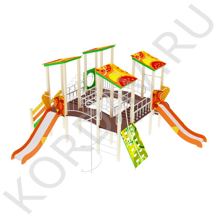Детский игровой комплекс включает в себя: 4 башни; 2 скат горки; 1 наклонный щит «Скалолаз»; лестницу; 2 дугообразных моста; 2 пары ограждений для дугообразных мостов; 1 вертикальный мост со спиралью; прямой мост; лаз; подвесной мост; перилы для лестницы; наклонную трубу из стальных колец.