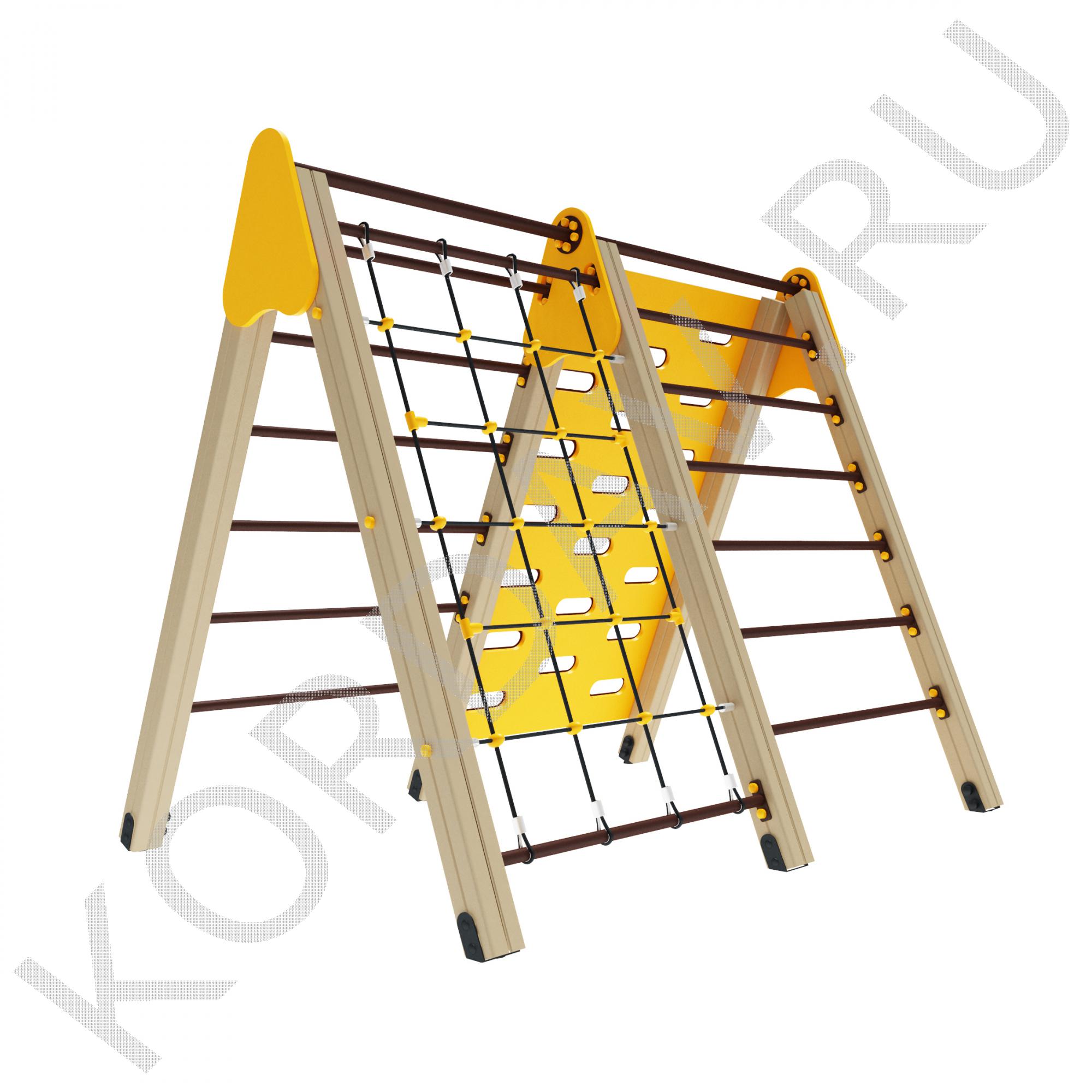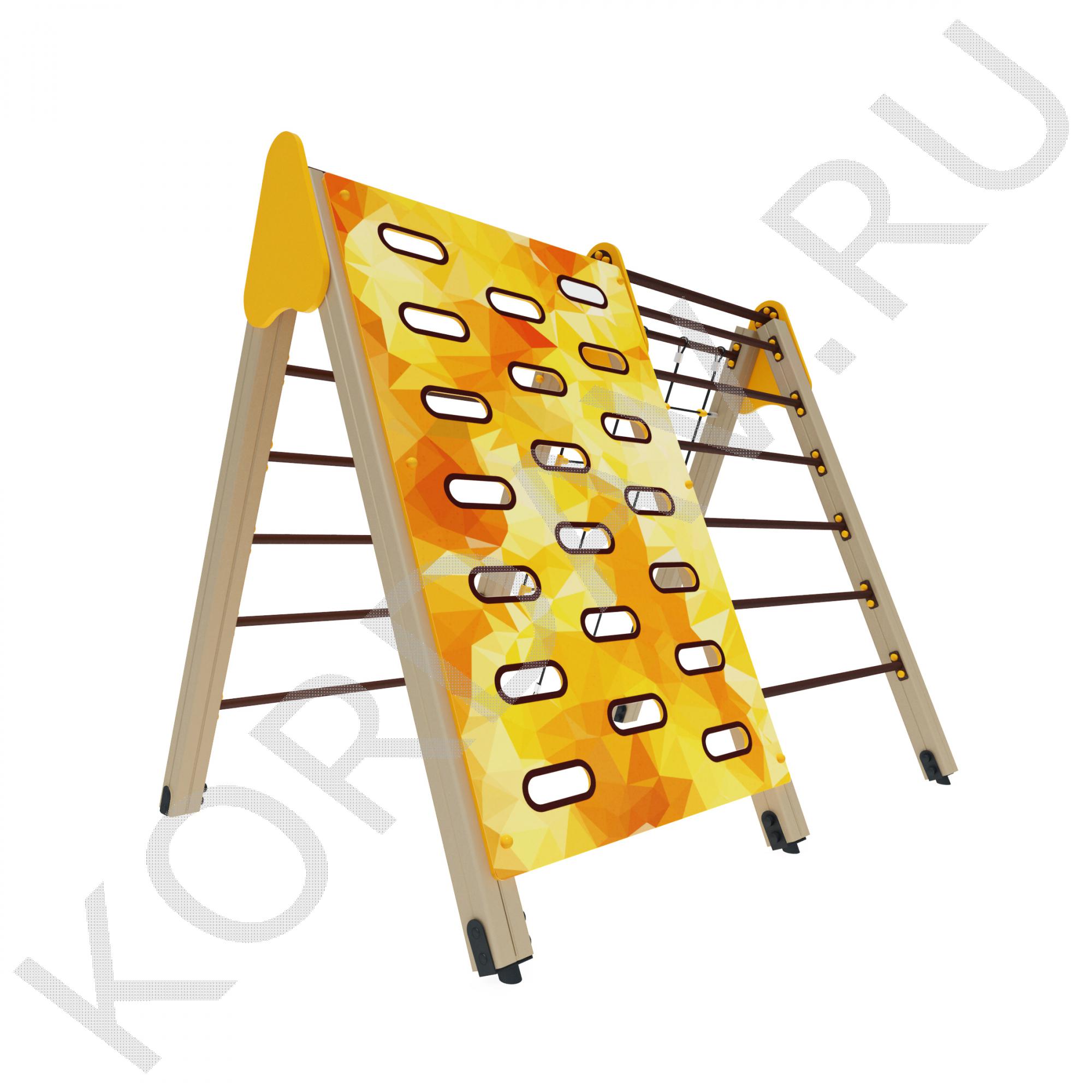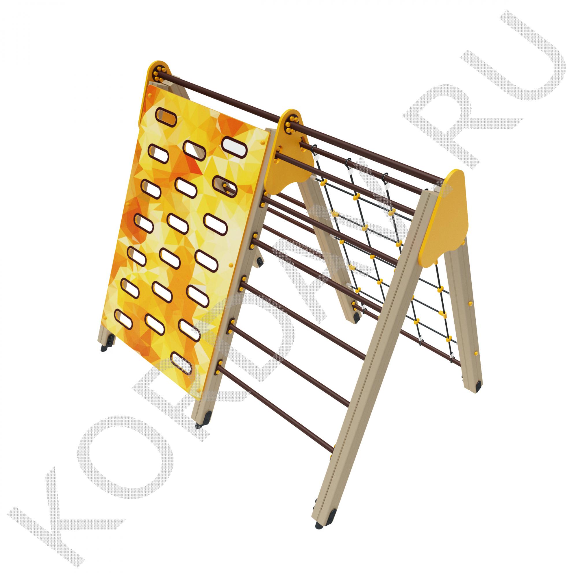 Гимнастический комплекс с альпинистской стенкой, имеет яркий и привлекательный дизайн. Он состоит из стенки для перелезания, сетки и двух лесенок. Занимаясь на нем, ребенок может укрепить мышцы рук, развить выносливость и силу, а также учит детей правильно преодолевать препятствия. Он предназначен для малышей возрастом от трех лет. Комплекс отличается прочностью, высотой и компактными габаритами, поэтому не несет опасности для детей. Изготовлен из безопасных материалов.