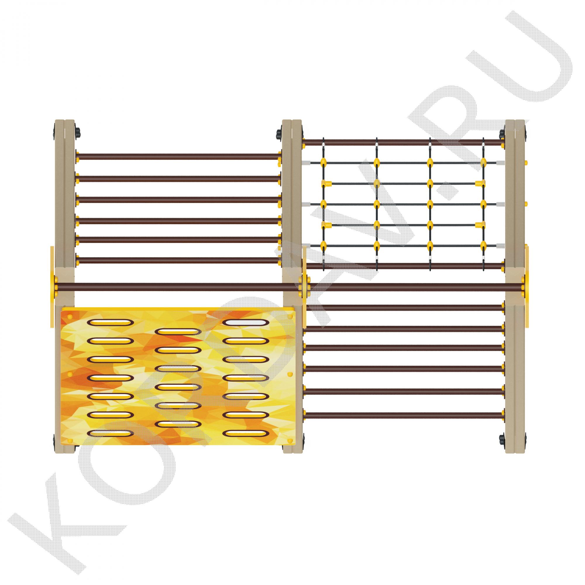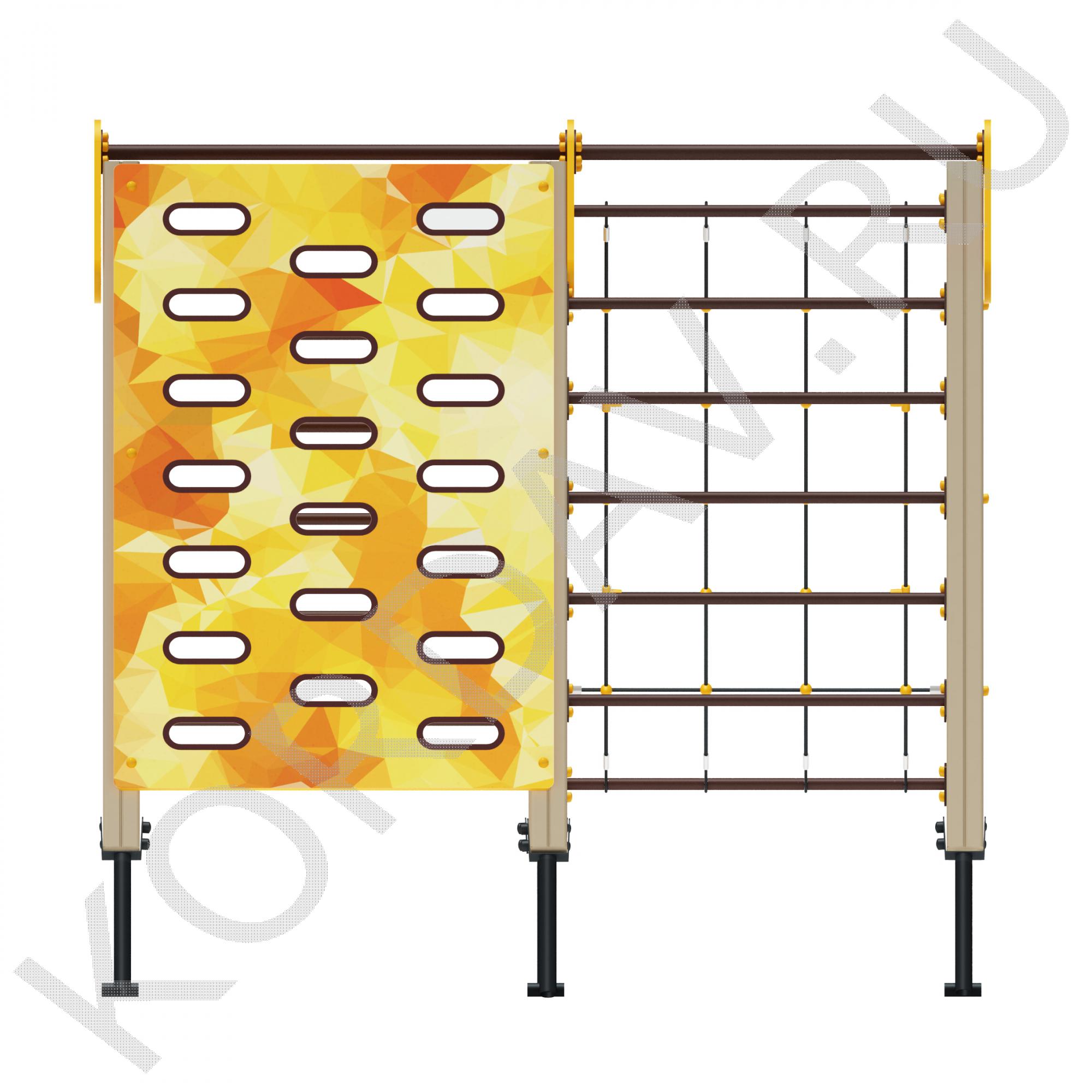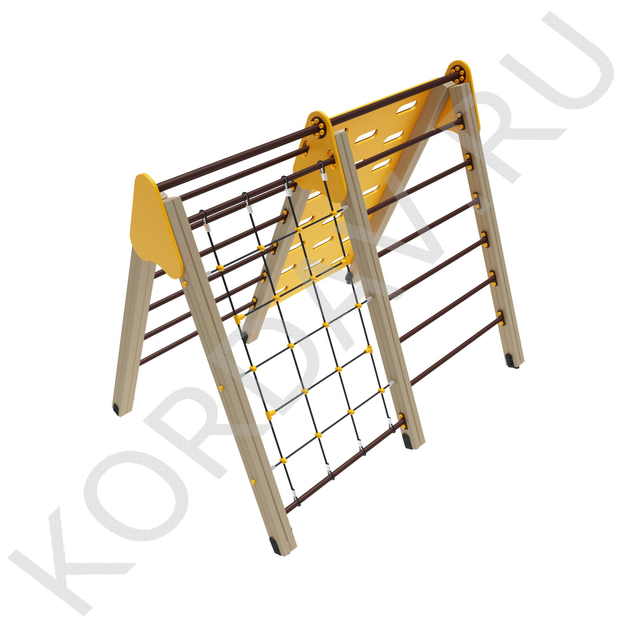 Гимнастический комплекс с альпинистской стенкой, имеет яркий и привлекательный дизайн. Он состоит из стенки для перелезания, сетки и двух лесенок. Занимаясь на нем, ребенок может укрепить мышцы рук, развить выносливость и силу, а также учит детей правильно преодолевать препятствия. Он предназначен для малышей возрастом от трех лет. Комплекс отличается прочностью, высотой и компактными габаритами, поэтому не несет опасности для детей. Изготовлен из безопасных материалов.