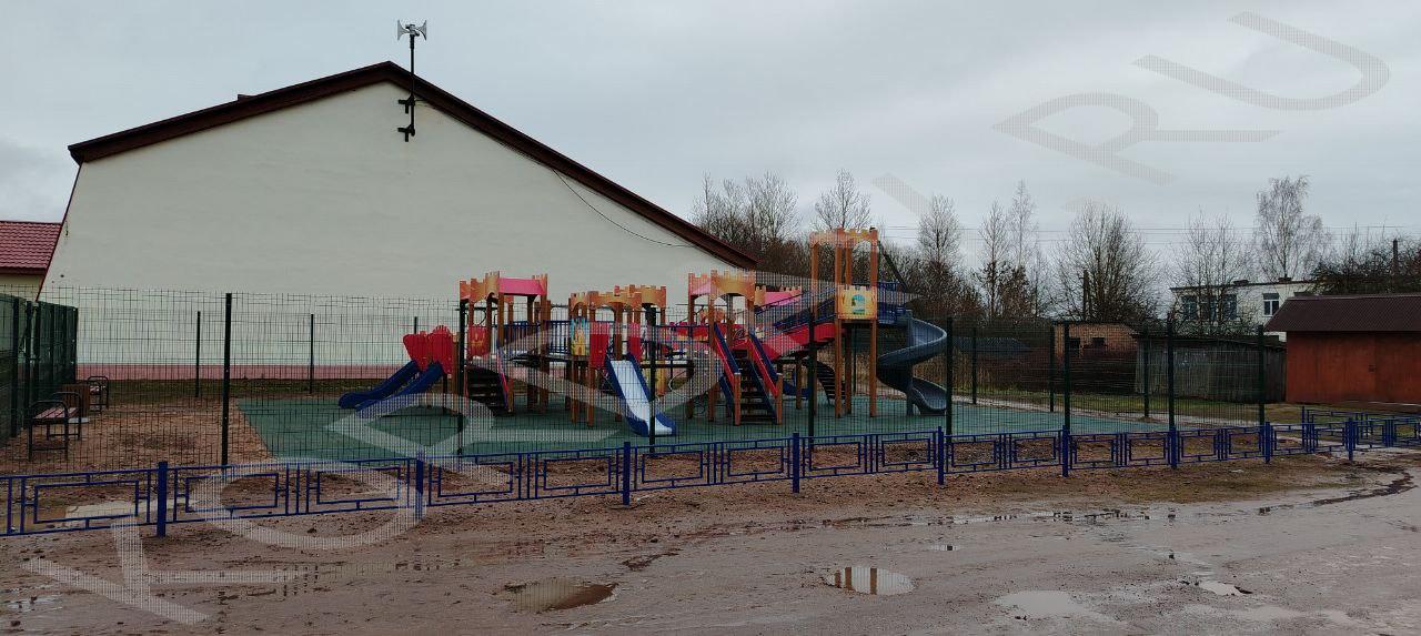 Детская площадка с резиновой плиткой и металлическим ограждением. Использовалось оборудование: